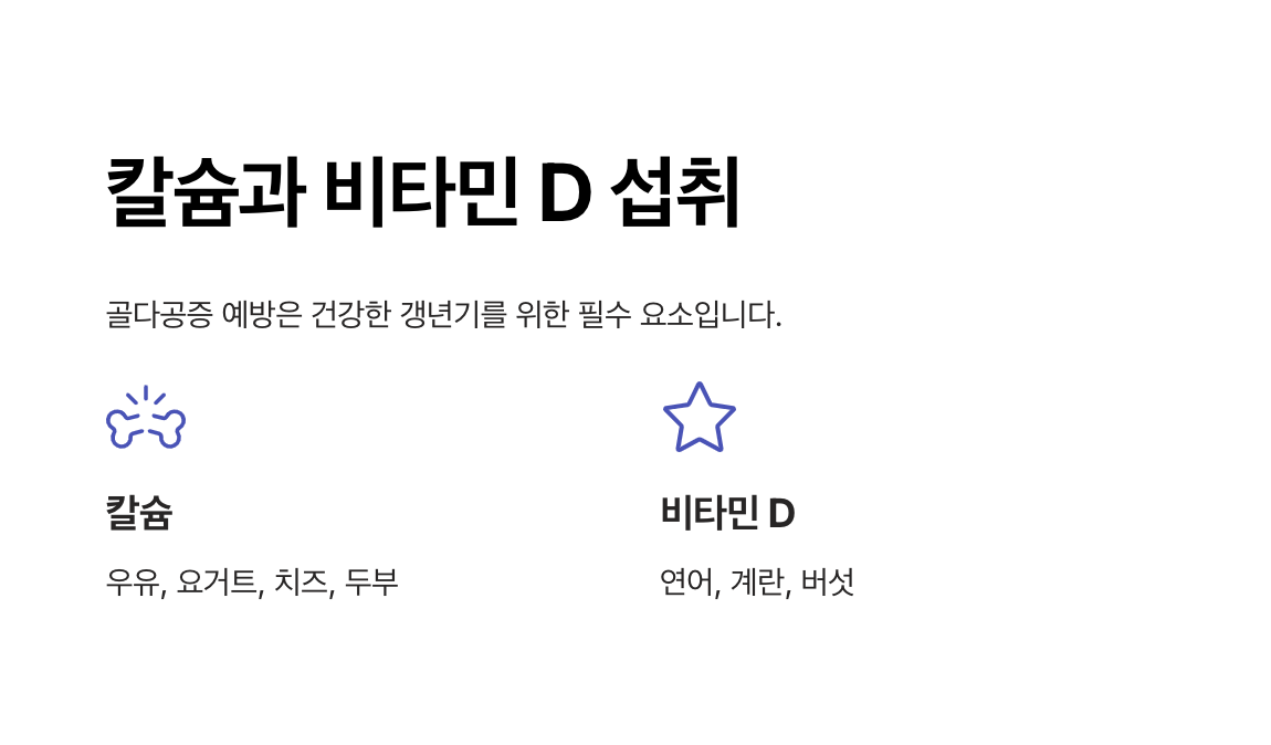 칼슘은 뼈를 튼튼하게 만들어주고, 비타민 D는 칼슘 흡수를 촉진시켜 골밀도를 유지하는 데 도움을 줍니다. 햇볕을 통해 비타민 D를 자연 합성하는 것도 좋은 방법입니다.