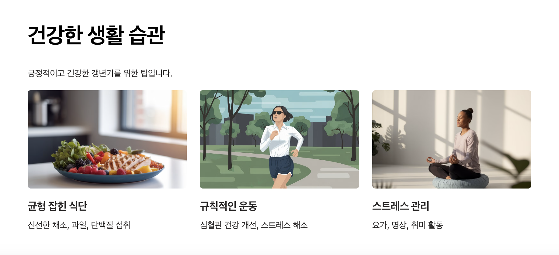 - 운동 병행: 규칙적인 운동은 뼈와 근육을 강화하고, 기분 전환에도 도움을 줍니다.