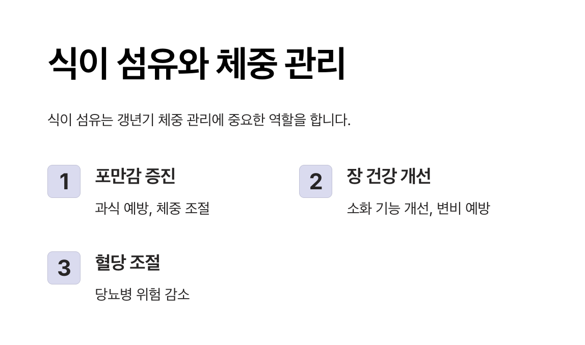 갱년기 동안 체중이 증가하는 경향이 있을 수 있습니다. 식이 섬유는 포만감을 주어 체중 관리에 도움을 주며, 장 건강을 개선하여 소화기능을 원활하게 합니다.