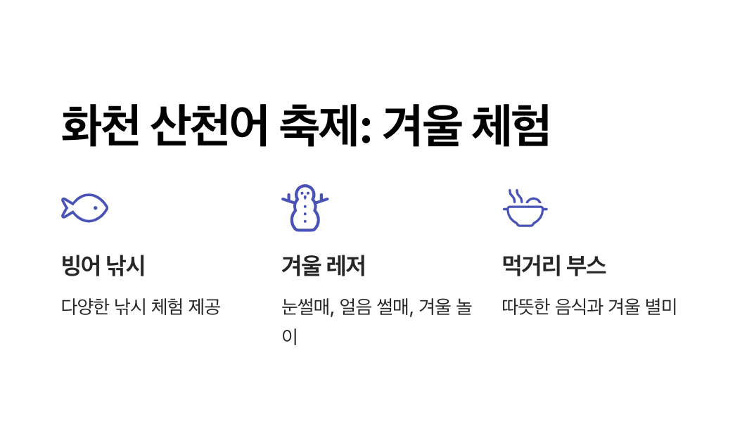 화천산천어축제는 세계적으로도 유명한 겨울 축제 중 하나로, 빙어낚시뿐만 아니라 산천어 낚시와 여러 가지 겨울 레저를 함께 즐길 수 있습니다. 2023년 기준 약 170만 명의 방문객을 기록했으며, 가족, 연인, 친구들과 함께 즐기기 좋은 대규모 행사입니다.