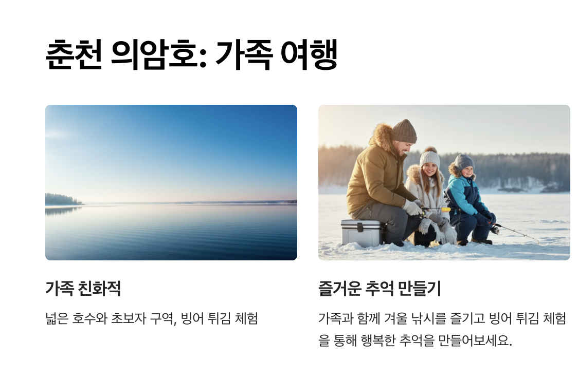 넓은 얼음판 위에서 낚시를 즐기고, 낚은 빙어로 맛있는 요리까지 경험할 수 있어 남녀노소 모두에게 사랑받는 겨울 명소로 손꼽힙니다.