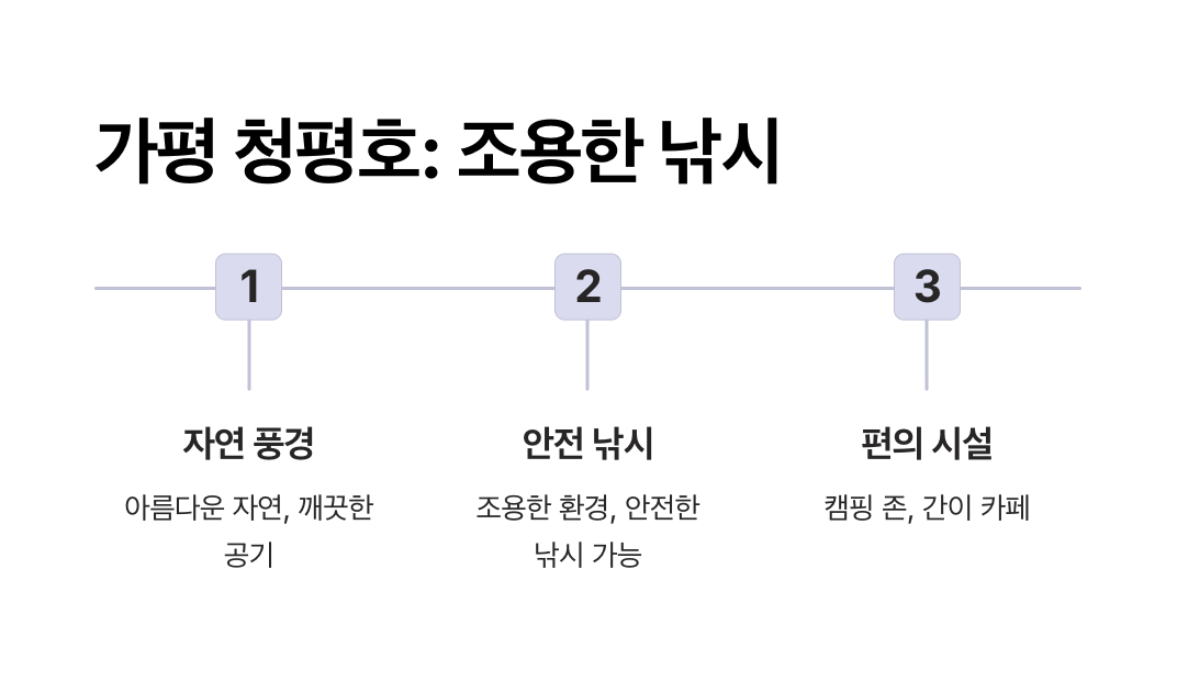 서울 및 수도권에서 가까운 청평호는 빙어낚시와 아름다운 겨울 경치를 동시에 즐길 수 있는 조용한 명소입니다. 호수 주변이 여유롭고 한적해 낚시에 집중하기 좋은 환경이며, 가족 단위 방문객에게 안전한 낚시터로 추천됩니다.