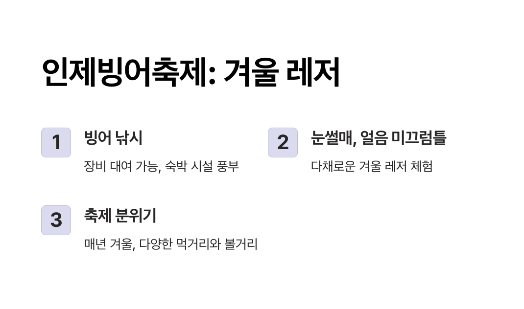 인제빙어축제는 매년 1월 인제 남면 부평리에서 열리는 대표적인 빙어낚시 축제입니다. 단순한 낚시를 넘어 겨울철 다양한 체험과 이벤트가 결합된 축제로, 가족 단위 방문객이 즐기기에 이상적인 명소입니다.