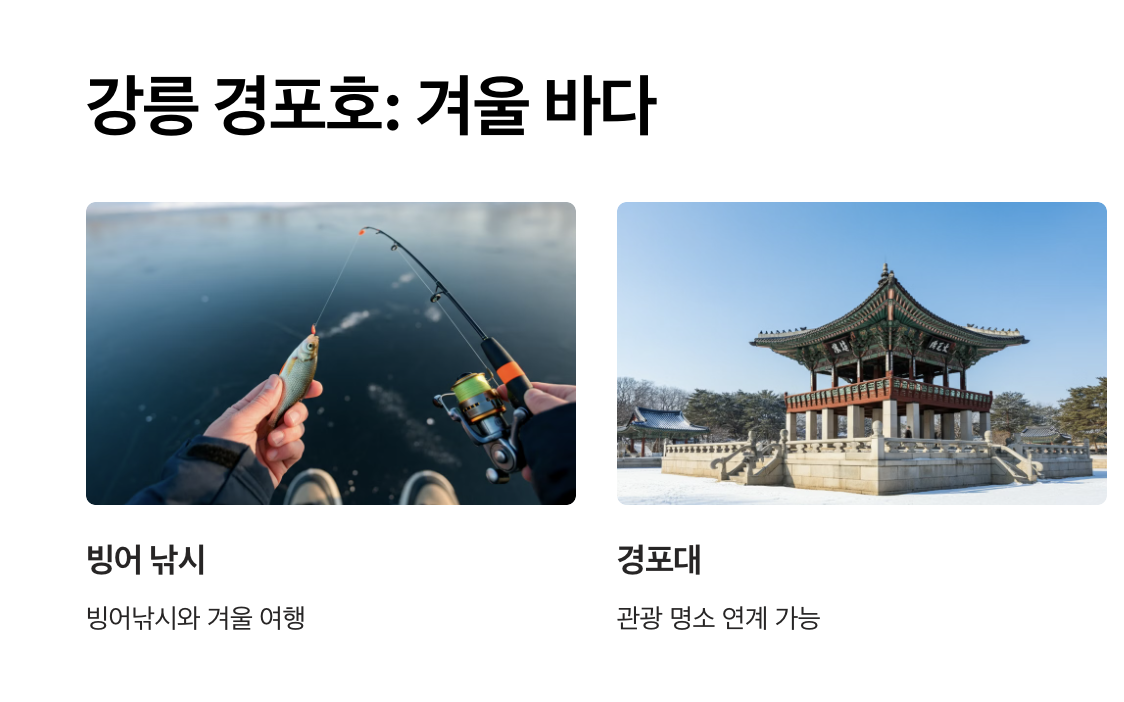 - 낚시 후 동해안의 겨울 풍경과 지역 특산물을 함께 즐길 수 있음.