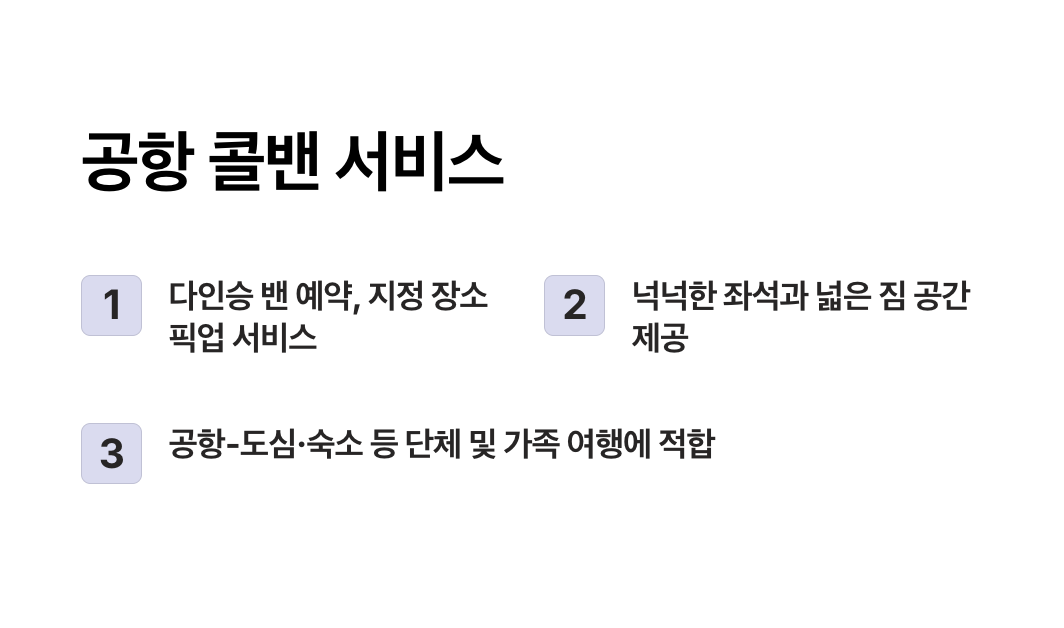 공항 콜밴은 일반 택시와 달리 다인승 밴을 이용해 예약한 시간에 지정된 장소에서 출발하는 픽업 서비스입니다.