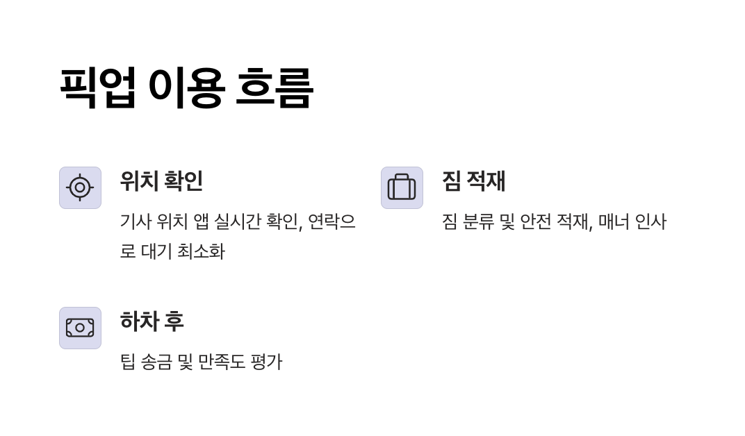 - 정확한 시간 관리: 예약 시 출발·도착 시간을 지정해 공항 대기 최소화