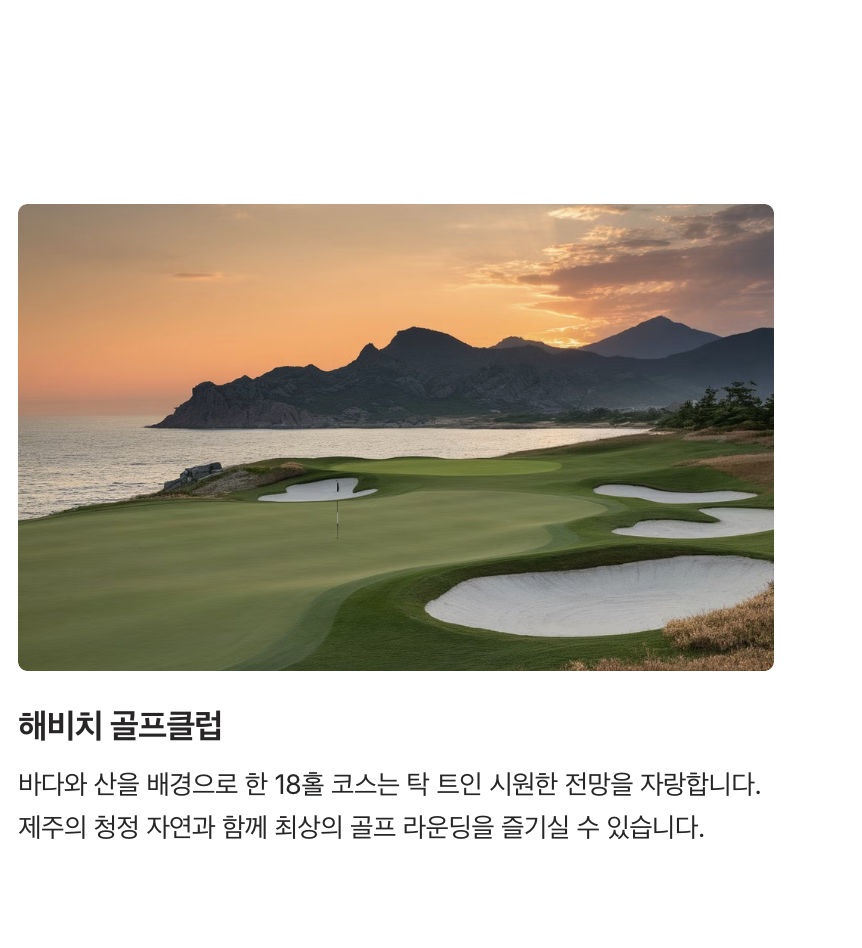 - 특징: 세계 100대 골프장에 선정된 명문 골프장으로, 제주 특유의 화산암 지형과 바다 전망이 어우러진 27홀 코스를 자랑합니다.