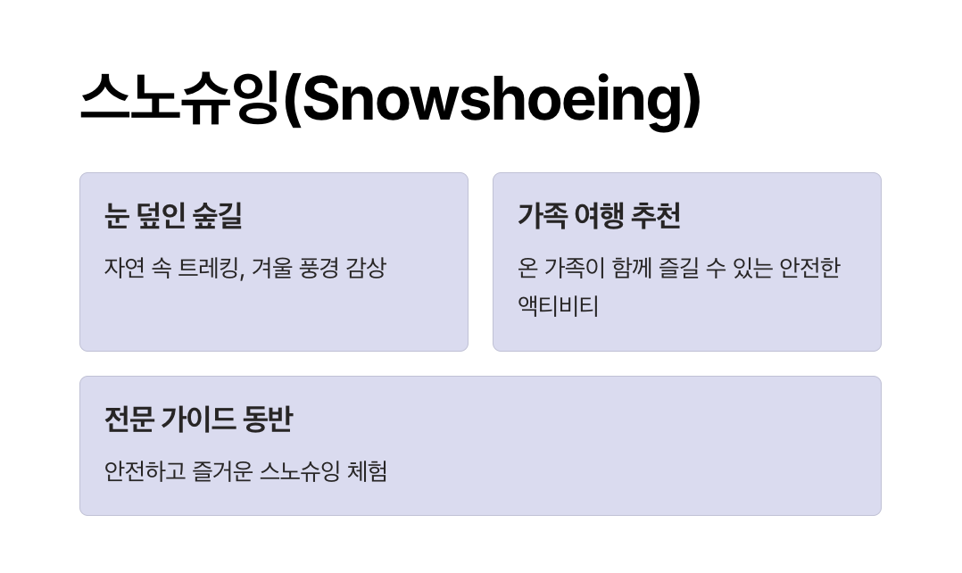 - 특징: 설산을 걸으며 눈 덮인 숲속과 고요한 겨울 경치를 체험할 수 있는 트레킹 활동.