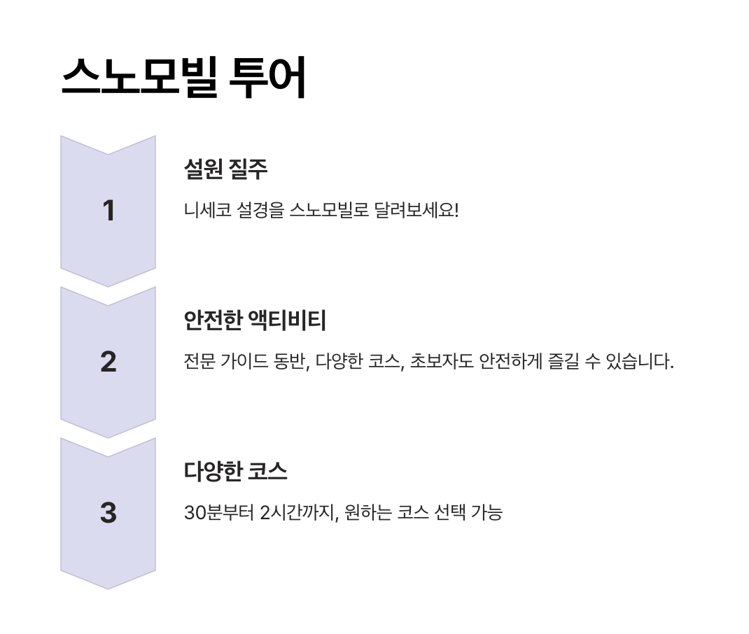 - 특징: 니세코의 광활한 설원을 스노모빌로 질주하며 짜릿한 스릴과 자연의 아름다움을 만끽할 수 있는 액티비티입니다.