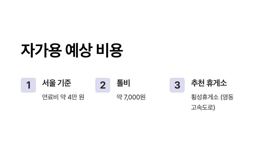 - 서울 출발: 약 2시간 30분~3시간 / 연료비 약 4~5만 원 / 톨비 약 7,000원