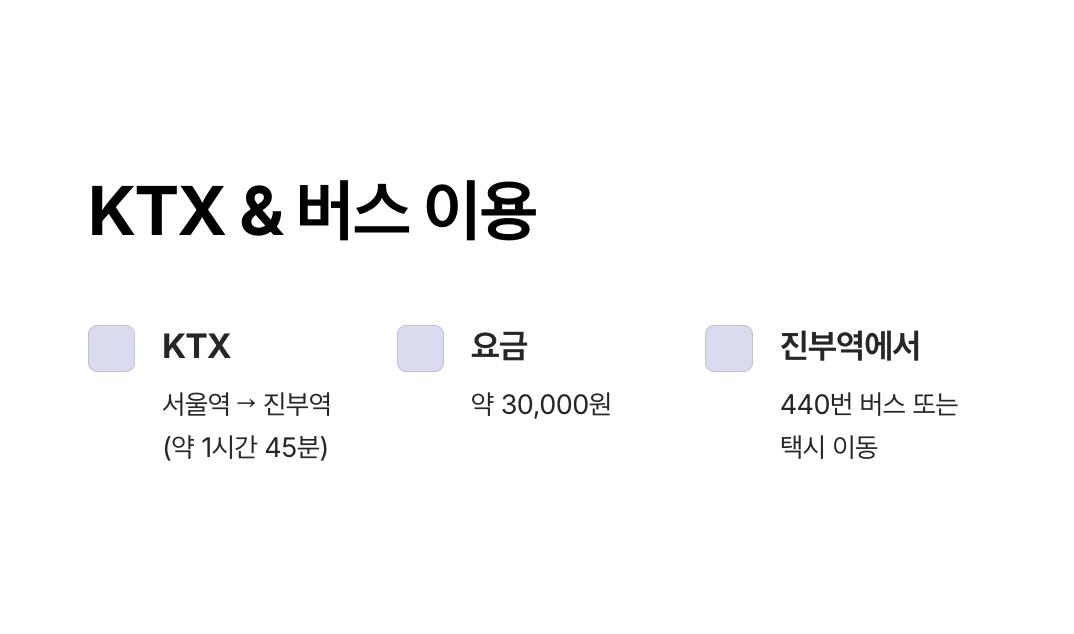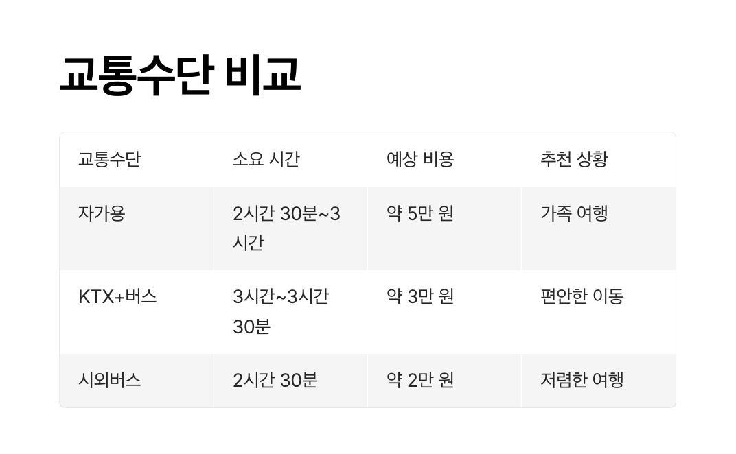 | KTX+버스 | 3시간~3시간 30분 | KTX 요금 + 버스 요금 약 3~4만 원 | ★★★☆☆ | 편안한 이동을 선호할 때 |