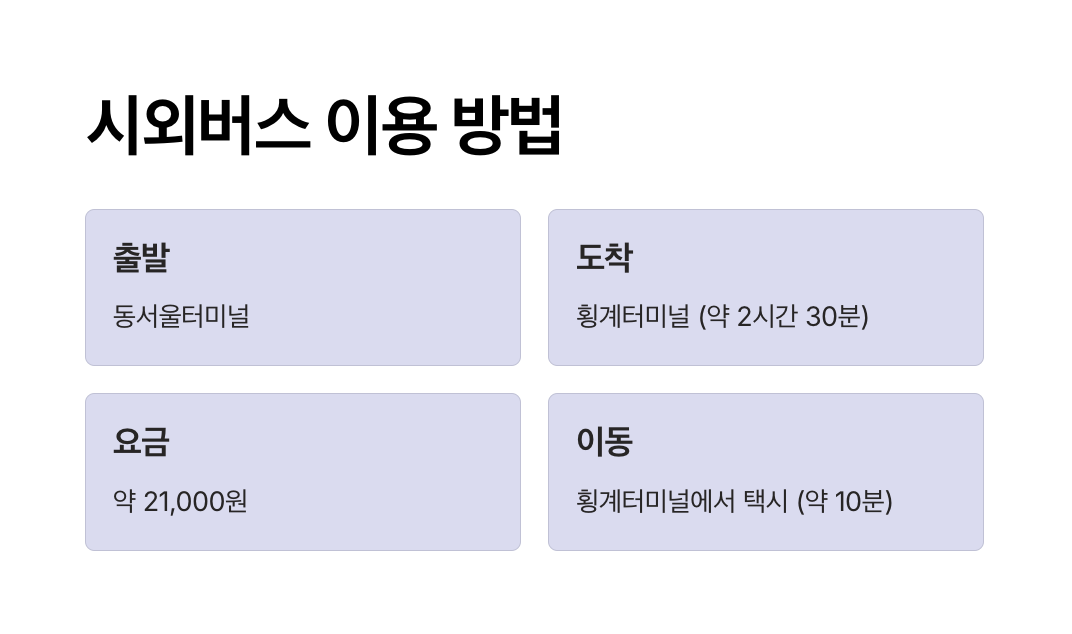 | 시외버스 | 3시간 30분~4시간 | 버스 요금 + 택시 요금 약 3만~4만 원 | ★★★☆☆ | 예산 절약을 원할 때 추천 |