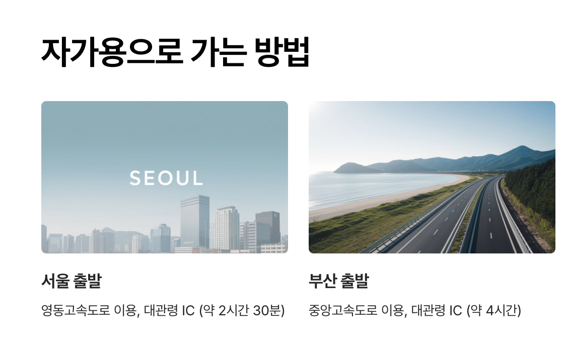 - 경로: 경부고속도로 → 영동고속도로 → 대관령 IC