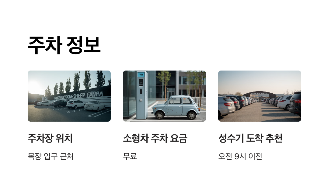 - 주차장은 목장 입구에서 도보로 약 5분 거리에 있어 이동이 편리합니다.