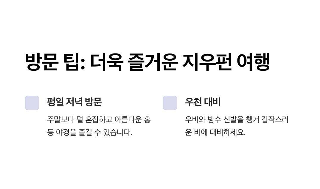 - 지우펀은 산간 지역 특성상 비가 자주 내리므로 우산과 방수 신발을 준비하세요.
