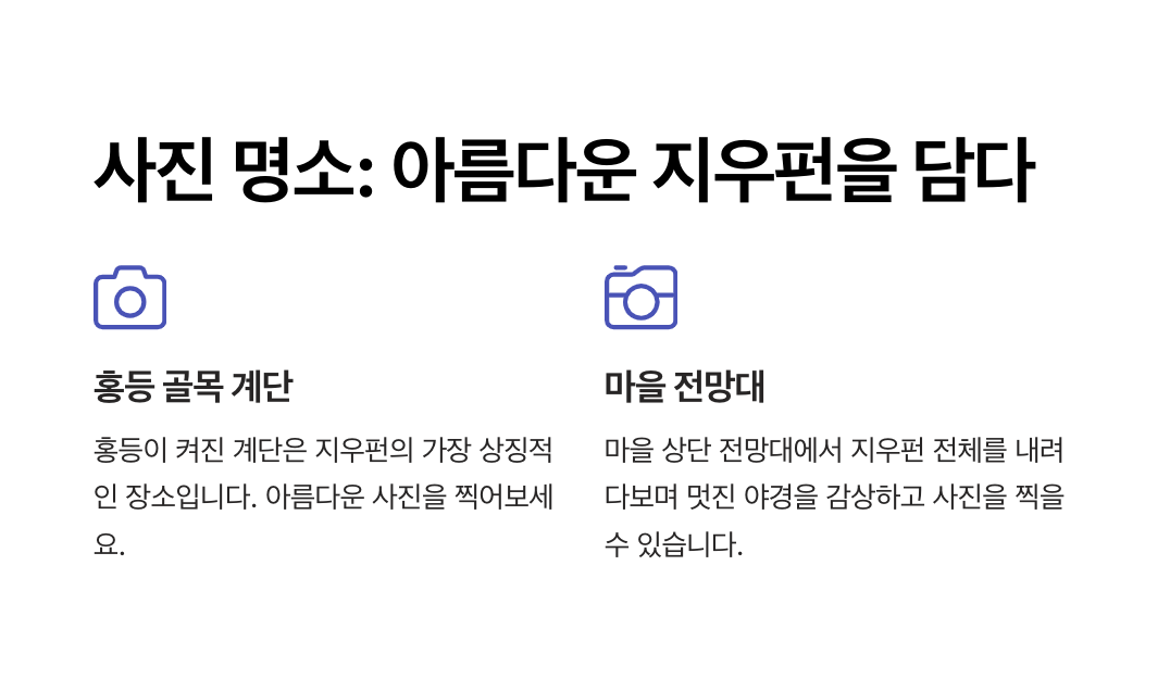 - 위치와 특징: 계단 위쪽에 자리 잡고 있어 마을 전경과 바다를 한눈에 감상 가능.