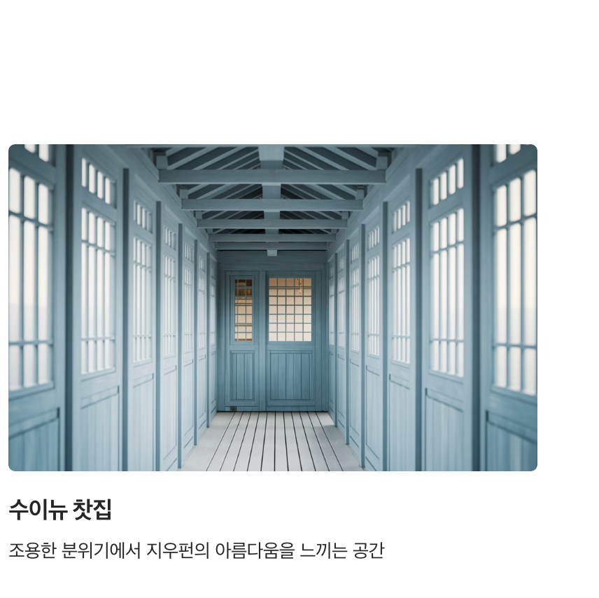 - 수이뉴 찻집: 조용하고 한적한 분위기를 즐길 수 있는 곳으로, 책을 읽으며 차 한 잔의 여유를 즐기기 좋습니다.