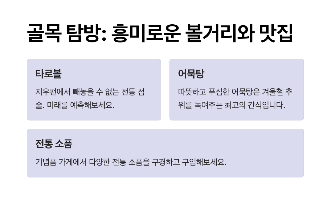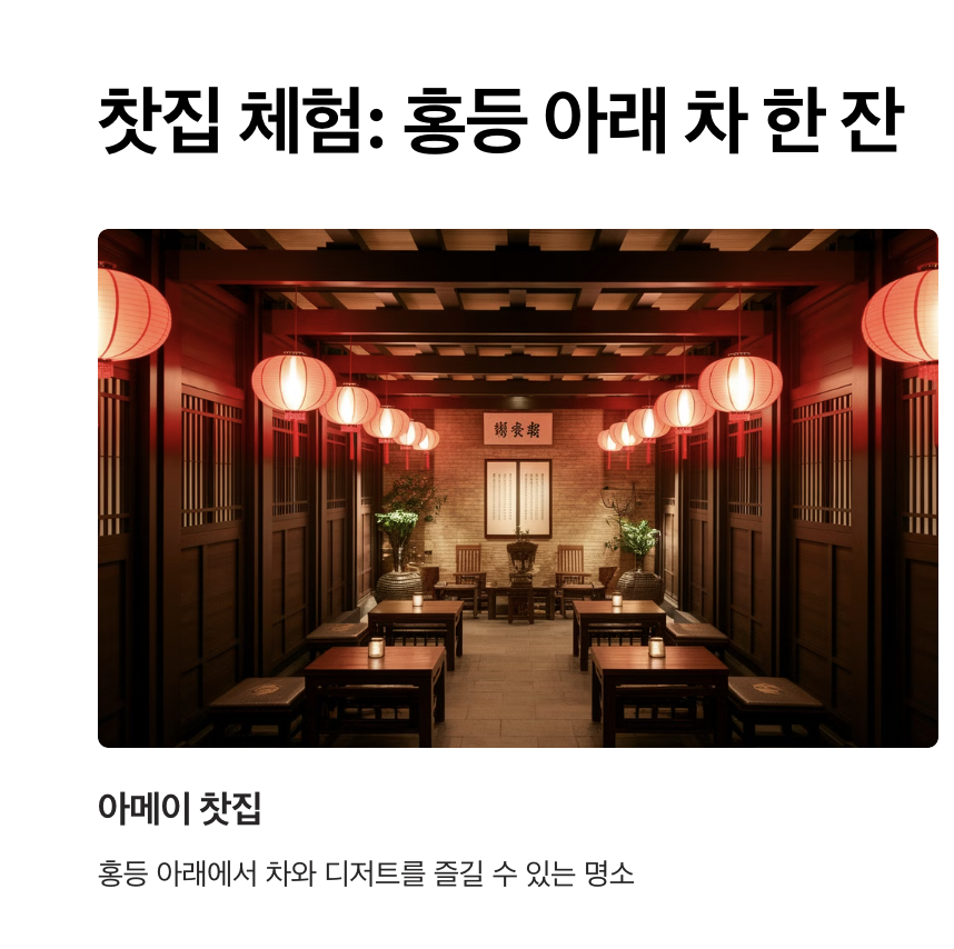 - 봄·가을: 쾌적한 날씨로 골목 탐방과 찻집 체험에 최적의 계절.