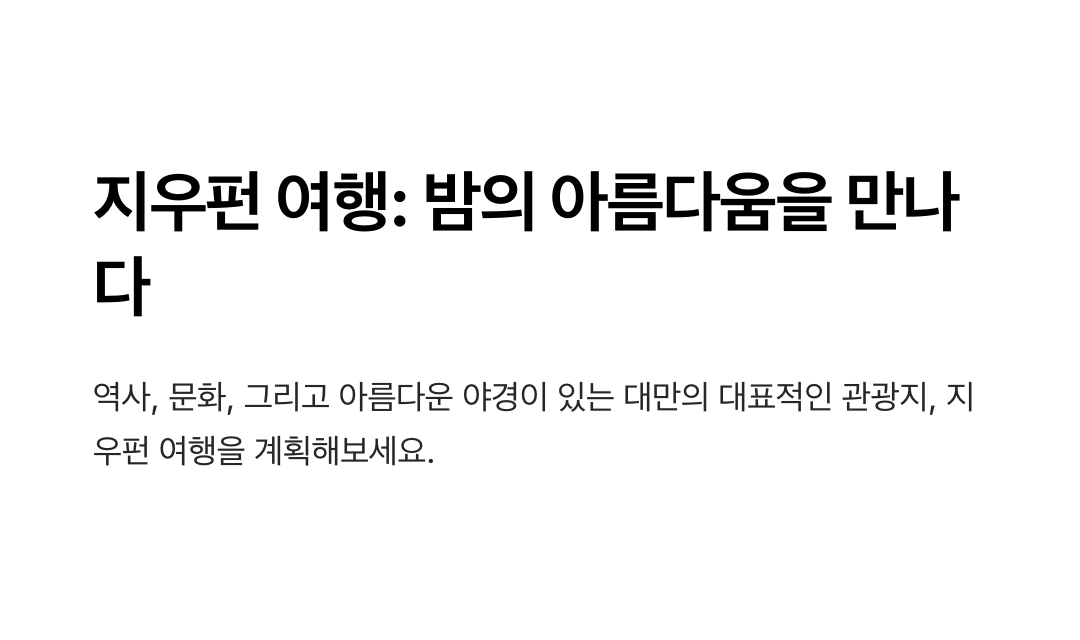 지우펀은 대만의 매력을 한껏 느낄 수 있는 특별한 여행지입니다. 홍등이 밝혀지는 저녁 무렵의 독특한 풍경, 고풍스러운 찻집의 여유로움, 골목 곳곳에서 만나는 현지 간식과 기념품 가게는 여행자들에게 잊지 못할 경험을 선사합니다.