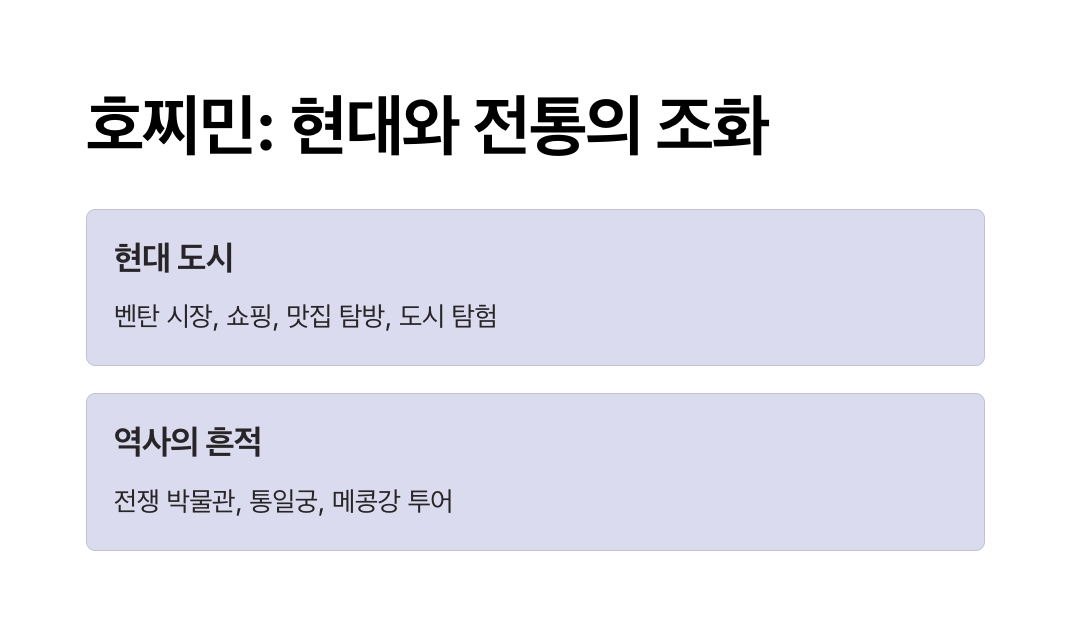 호찌민은 베트남 최대 도시로, 현대적인 라이프스타일과 전통적인 문화가 조화를 이루는 곳입니다.