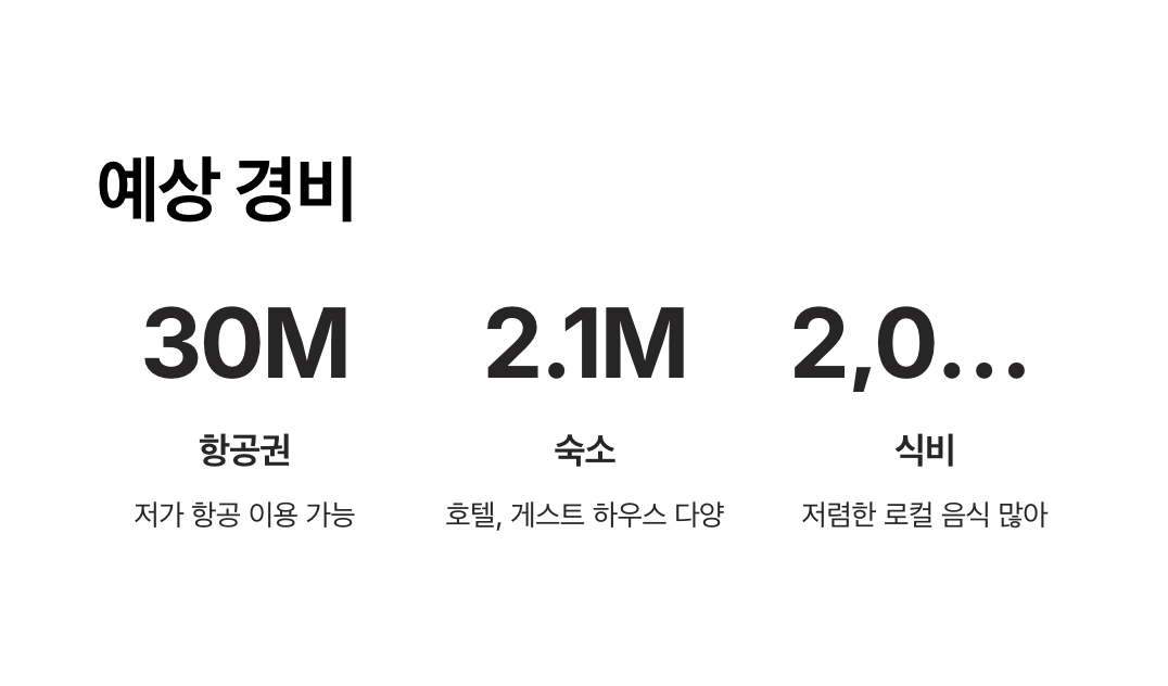 - 항공권: 왕복 약 30~50만 원(비성수기 기준).