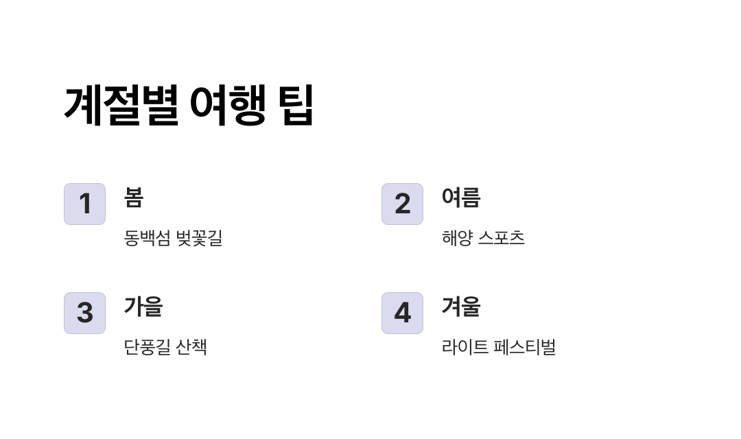 - 여름: 자외선 차단제, 비치 타월, 아쿠아슈즈.