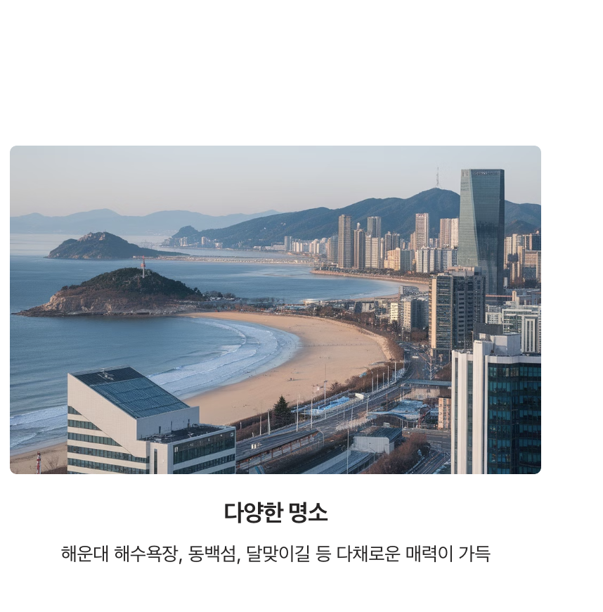 - 동백섬: 동백나무 숲길을 따라 산책하며 해운대 바다의 전경을 감상할 수 있습니다. 특히 겨울철 동백꽃이 피는 풍경은 놓치지 말아야 할 포인트입니다.