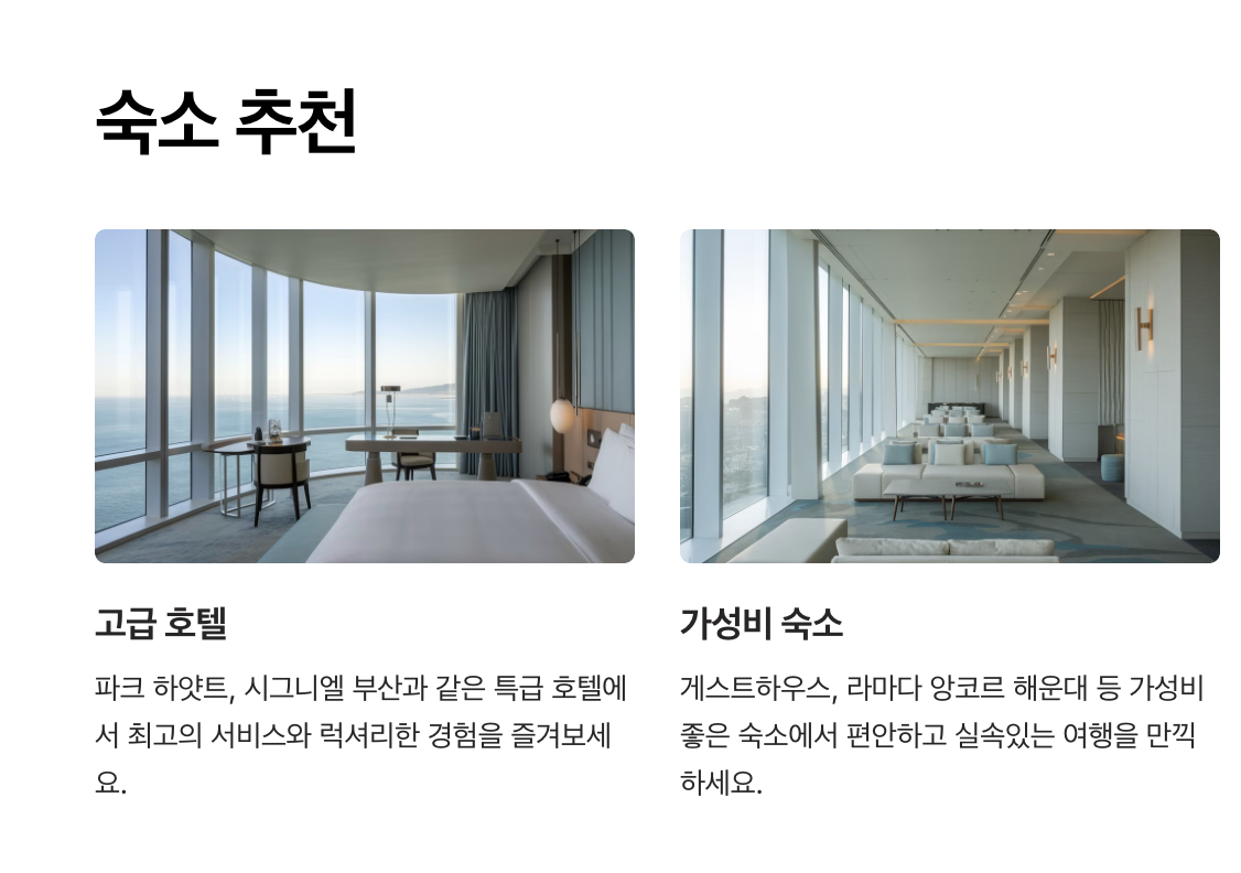 - 시그니엘 부산: 프리미엄 시설과 해운대 전경을 자랑하는 최고급 호텔입니다.