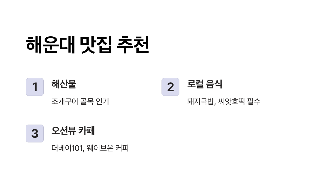 - 웨이브온 커피: 달맞이길 초입에 위치해 있으며, 해운대 바다를 배경으로 힐링할 수 있는 곳입니다.