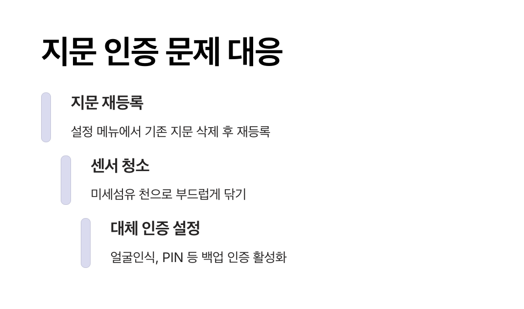 지문 인식 실패는 단순 개인 컨디션 문제일 수 있으나, 반복될 경우 삼성페이 안됨 원인으로 분류되므로 주기적인 재등록이 필요합니다.