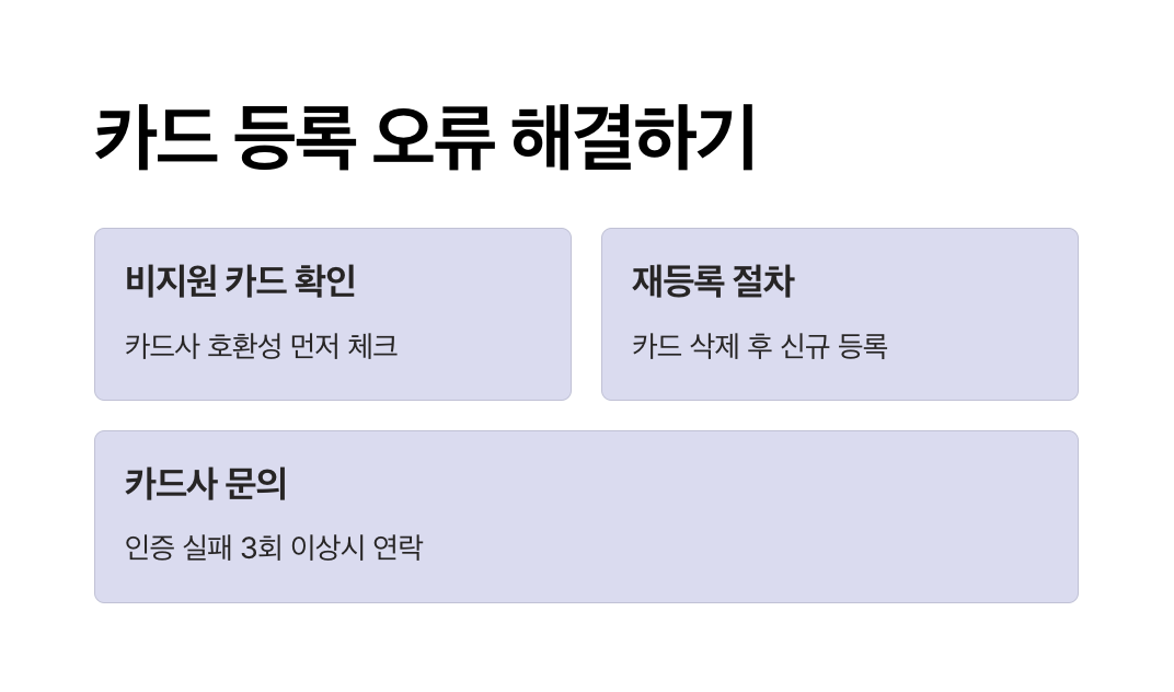 무턱대고 앱을 지우거나 카드 등록을 다시 하기 전에, 아래에서 소개하는 주요 오류 사례를 하나씩 점검해보세요. 문제 해결에 훨씬 빠르고 효과적입니다.