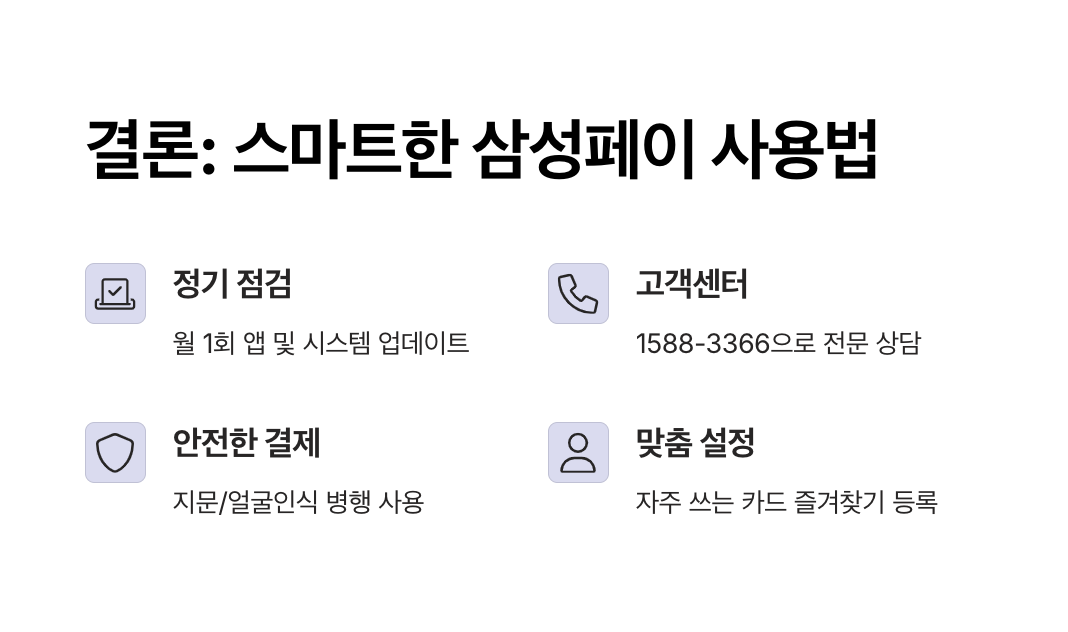삼성페이는 보안이 중요한 서비스이기 때문에 사소한 설정 하나만 달라도 오류가 발생할 수 있습니다. 기본 점검과 사용자 조치 후에도 문제가 지속된다면, 고객센터나 전문 엔지니어의 도움을 받는 것이 가장 빠른 해결책입니다.