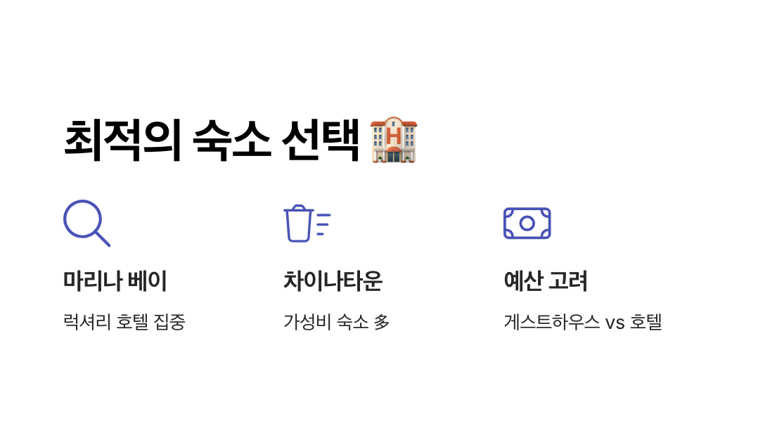 - 차이나타운: 가성비 좋은 숙소와 게스트하우스가 많아 예산이 한정된 여행자에게 적합합니다.