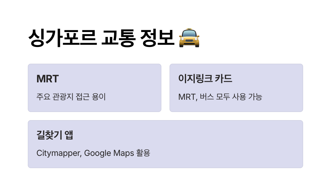 - 이지링크(Ez-Link) 카드: 충전식 교통카드로 MRT, 버스 등 모든 대중교통에서 사용 가능하며 공항과 MRT 역에서 쉽게 구매할 수 있습니다.