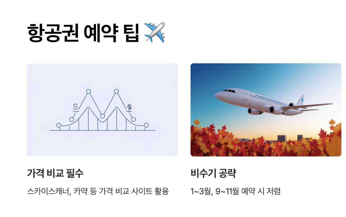 - 비수기(1월~3월, 9월~11월)에는 항공권 요금이 상대적으로 낮으며, 프로모션을 자주 확인할 수 있습니다.
