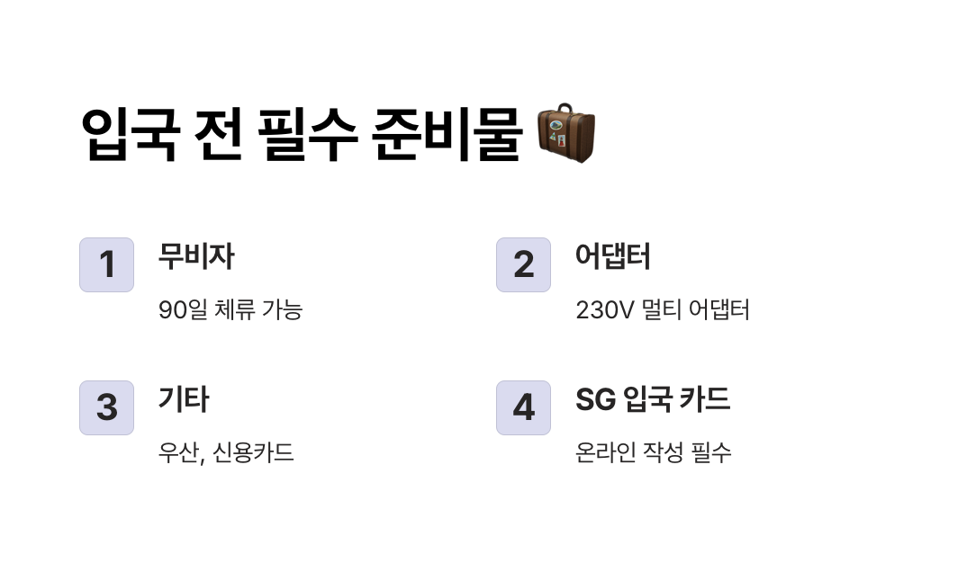싱가포르는 입국 절차가 간단하지만 사전에 준비해야 할 사항을 체크하면 더욱 원활합니다.