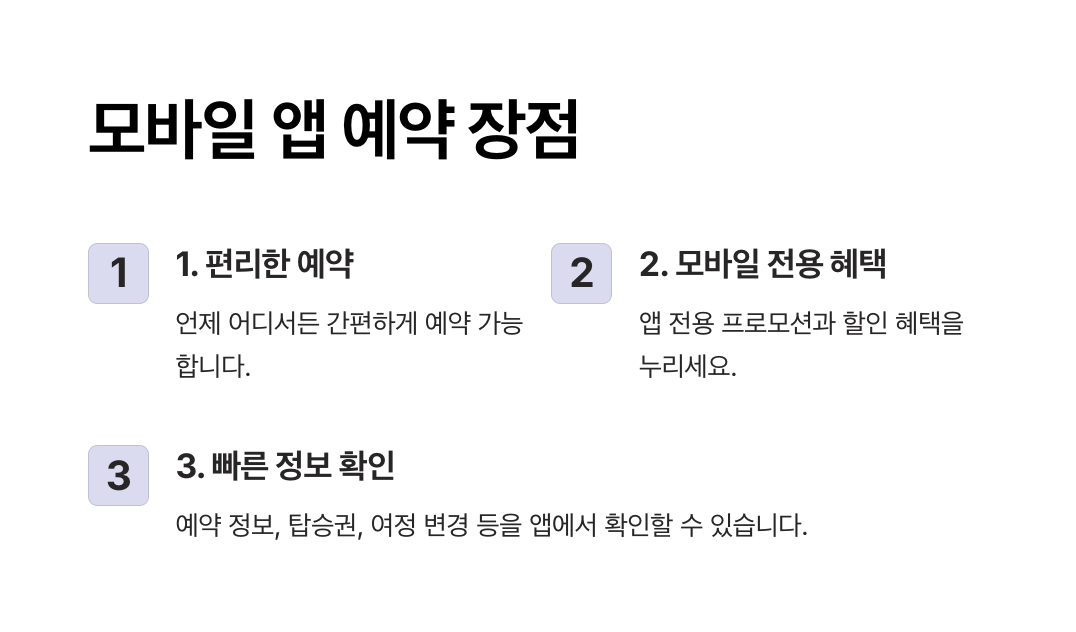 - A4. 모바일 앱에서는 항공권 예약뿐만 아니라 체크인, 실시간 항공편 조회, 마일리지 적립 내역 확인, 공항 라운지 이용권 구매 등 다양한 서비스를 제공합니다.