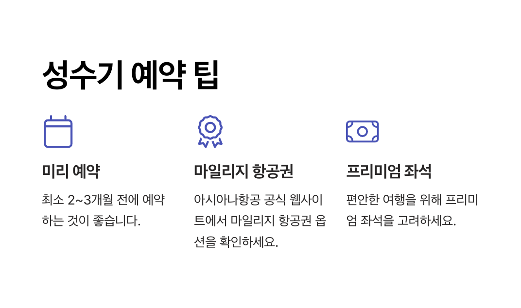 성수기 항공권은 최소 2~3개월 전에 예약하는 것이 좋습니다. - 마일리지 사용 팁: