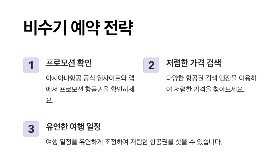 아시아나항공 공식 웹사이트의 이벤트 섹션에서 비수기 프로모션 정보를 확인하세요. - 유용한 예약 플랫폼: