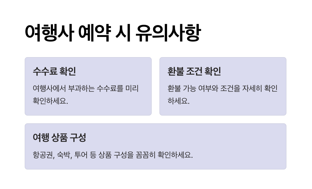 - 여행사마다 수수료가 다를 수 있으며, 항공권 취소 및 변경 규정이 엄격할 수 있으니 반드시 확인하세요.
