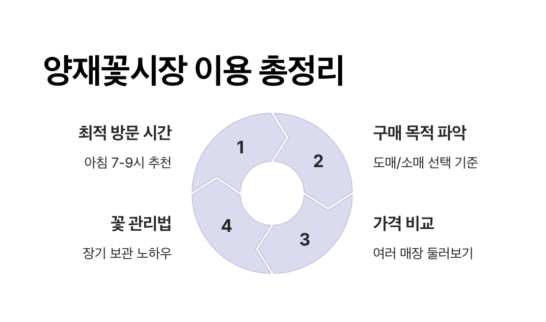 이제 양재꽃시장 구조, 최적의 방문 시간, 가격 비교 요령, 필수 준비물까지 완벽하게 알게 되었습니다. 방문 전에 동선을 미리 계획하고, 이번 글에서 제공한 쇼핑 팁을 활용한다면 더욱 만족스러운 쇼핑을 할 수 있습니다.