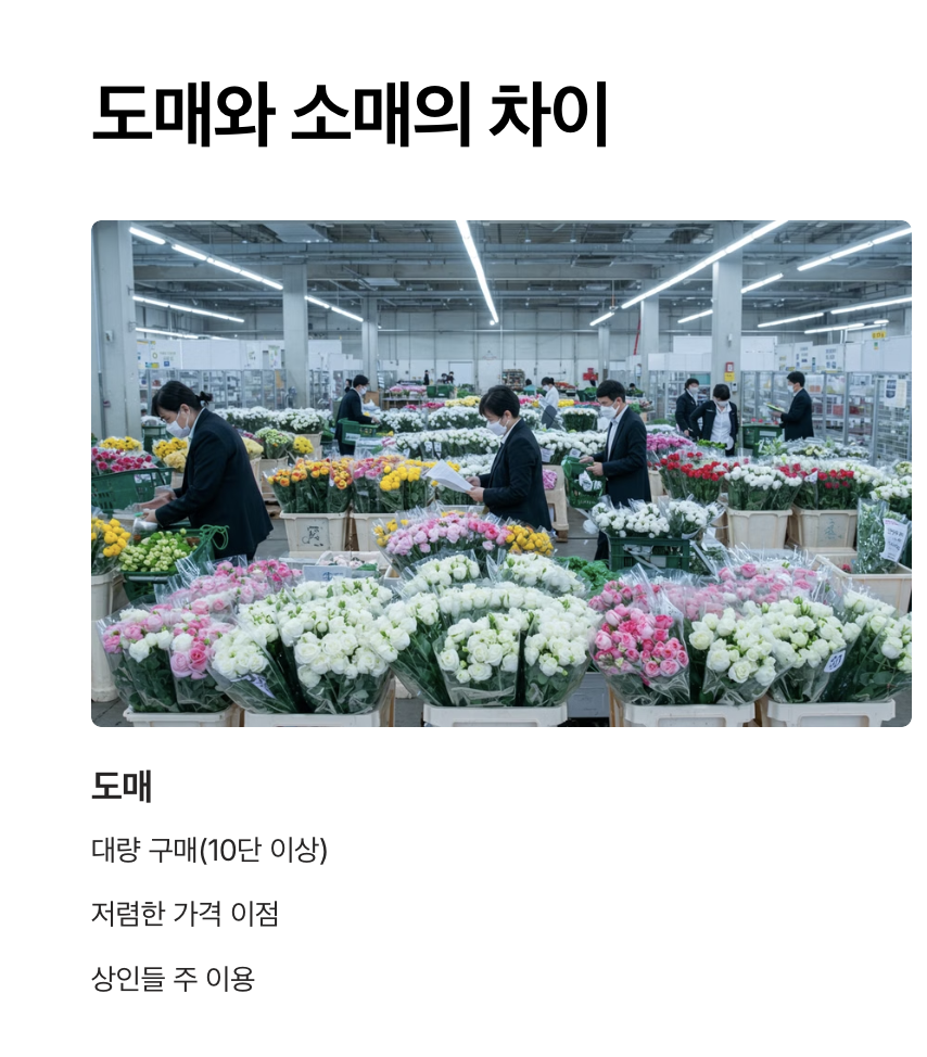 - 주로 플로리스트, 꽃집, 행사 업체 등이 대량으로 꽃을 구매하는 공간