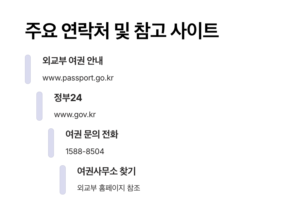 | 2. 외교부 여권안내 홈페이지 | 외교부에서 운영하는 공식 여권 안내 사이트로, 여권 발급, 재발급, 유효기간 및 사진 규정 등 최신 정보를 제공합니다. |