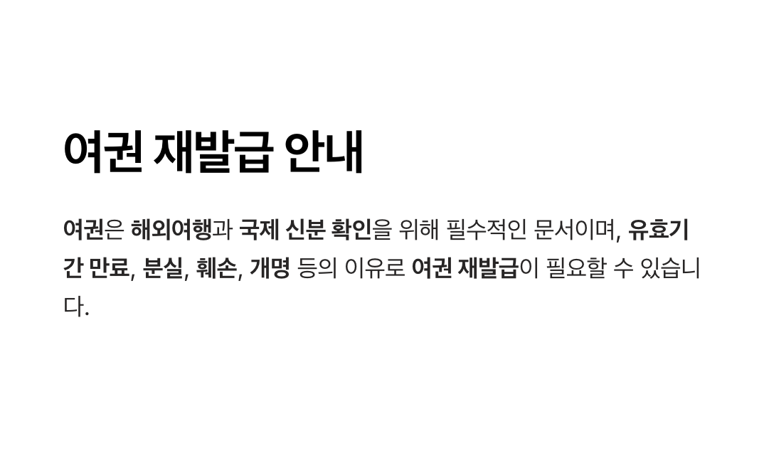 | 3. 해외 체류 중 여권 재발급 (재외공관 안내) | 해외 체류 중 여권을 재발급받아야 하는 경우, 가까운 한국 대사관·영사관에서 신청 가능한 방법 및 필요 서류를 확인할 수 있습니다. |