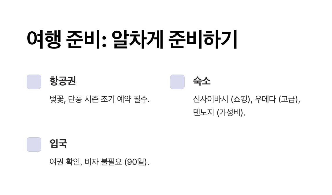 - 항공권 예약 시기: 여행 2~3개월 전에 예약하면 저렴한 요금을 찾을 수 있습니다. 벚꽃 시즌(3월~4월)과 단풍 시즌(10월~11월)에는 예약 경쟁이 치열하므로 미리 준비하세요.