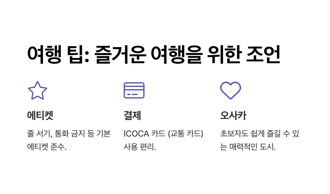 - 전자 결제: ICOCA 카드나 신용카드를 이용하면 편리합니다.