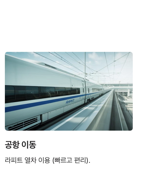 - 공항으로 이동: 공항 리무진 버스 또는 라피트 열차로 공항 이동 ➤ 출국.