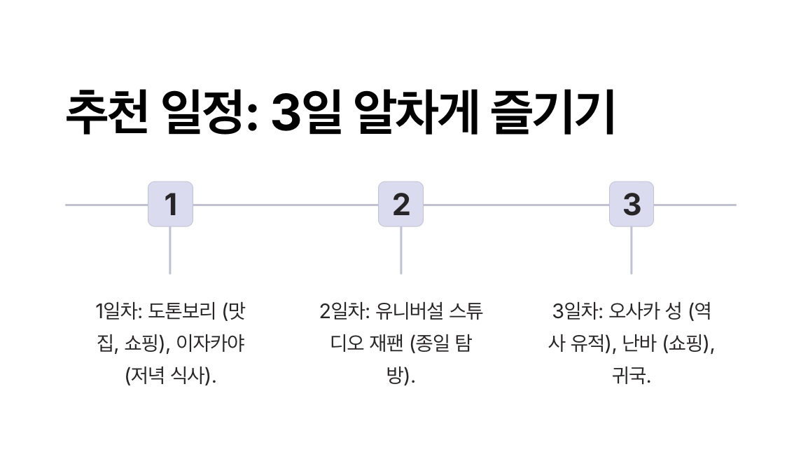 - 저녁: 난바의 유명한 이자카야(일본식 주점)에서 저녁 식사하며 오사카 분위기 만끽.