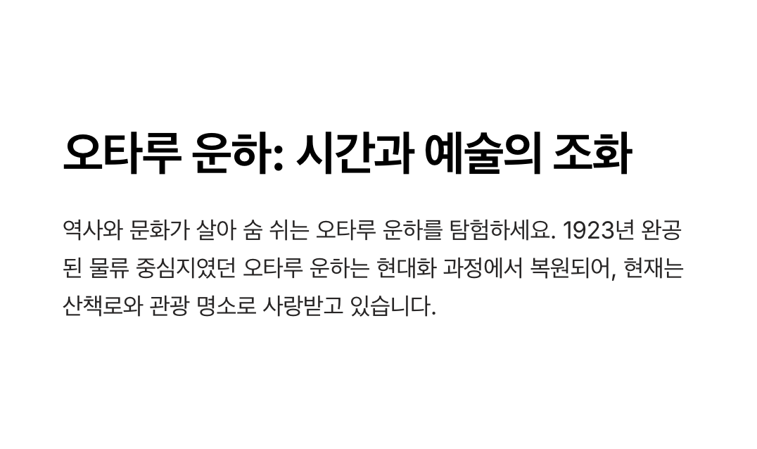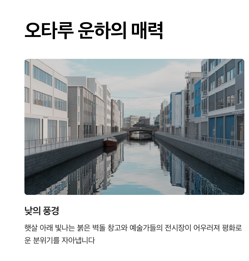 - 역사적 배경: 오타루 운하는 1923년 완공된 총 길이 1.1km의 운하로, 당시 홋카이도의 주요 항구 도시였던 오타루의 물류 중심 역할을 했습니다. 대형 선박에서 소형 선박으로 화물을 옮기는 장소로 사용되었으며, 항구와 인접한 창고들은 물류 거점으로 기능했습니다.