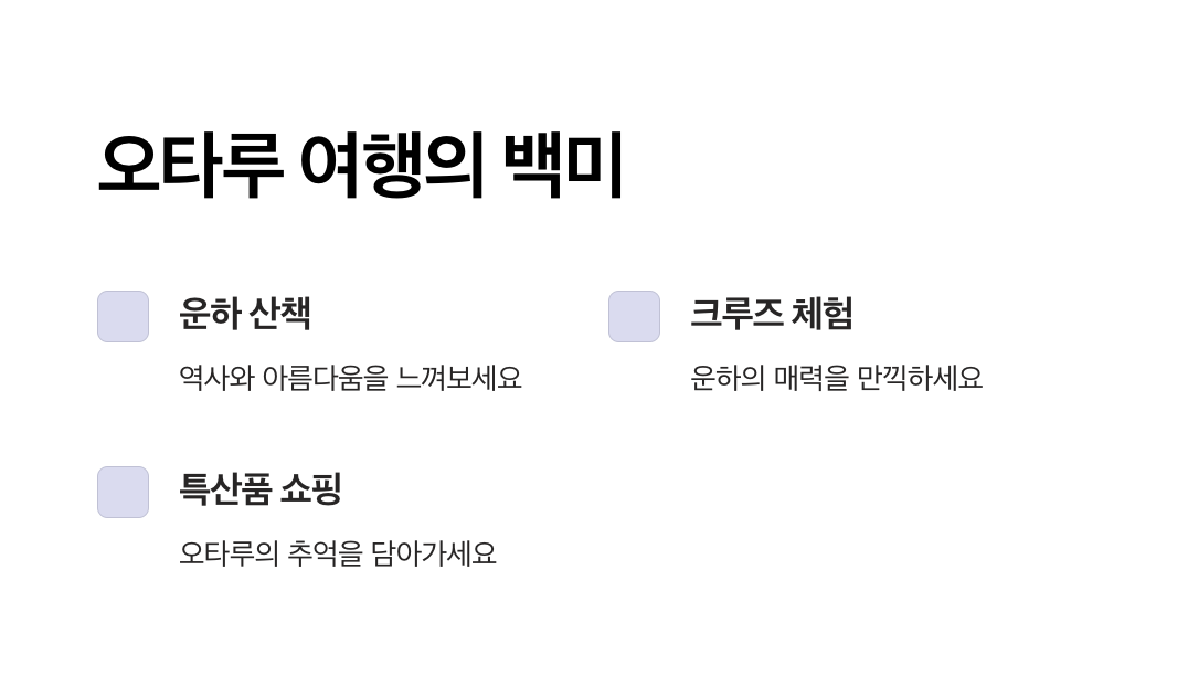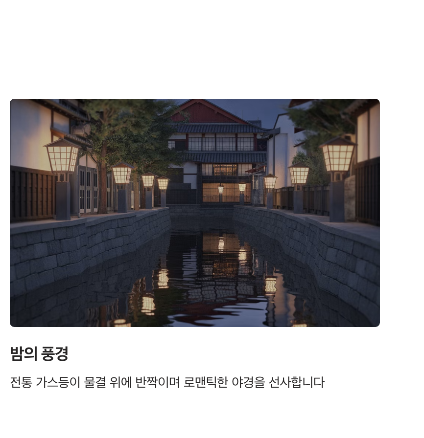 오타루는 낭만적인 운하 산책, 독창적인 유리 공예 체험, 그리고 신선한 해산물 요리를 통해 여행의 모든 매력을 한곳에서 느낄 수 있는 특별한 도시입니다. 오타루 운하의 야경을 감상하거나, 직접 만든 유리 작품을 손에 쥐며 여행의 추억을 간직하시길 바랍니다.